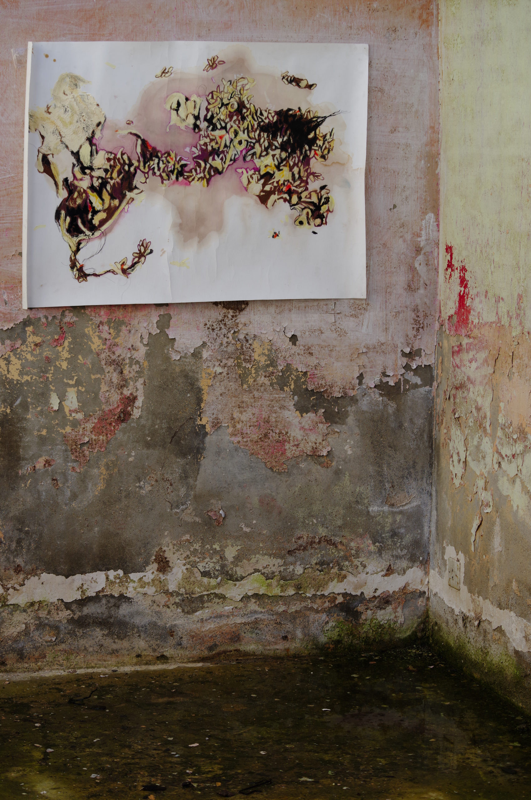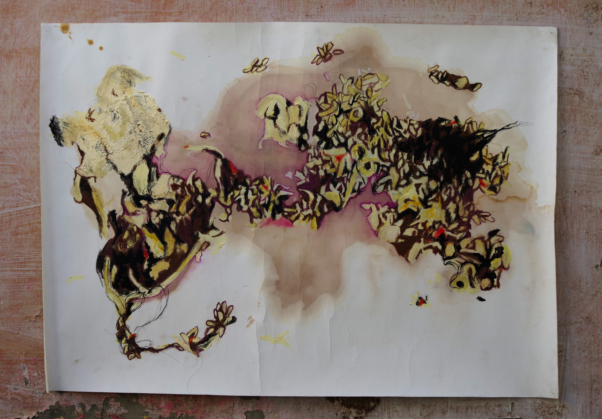 ALTÉRATION SUBSTANTIEL Hiver 2023 Paris-Trestel Production d’une peinture d’un mètre sur deux, reproduisant les restes alimentaires d’un fond d’évier. Technique de la gouache, aquarelle, pastels gras, crayons de couleur et feutres.