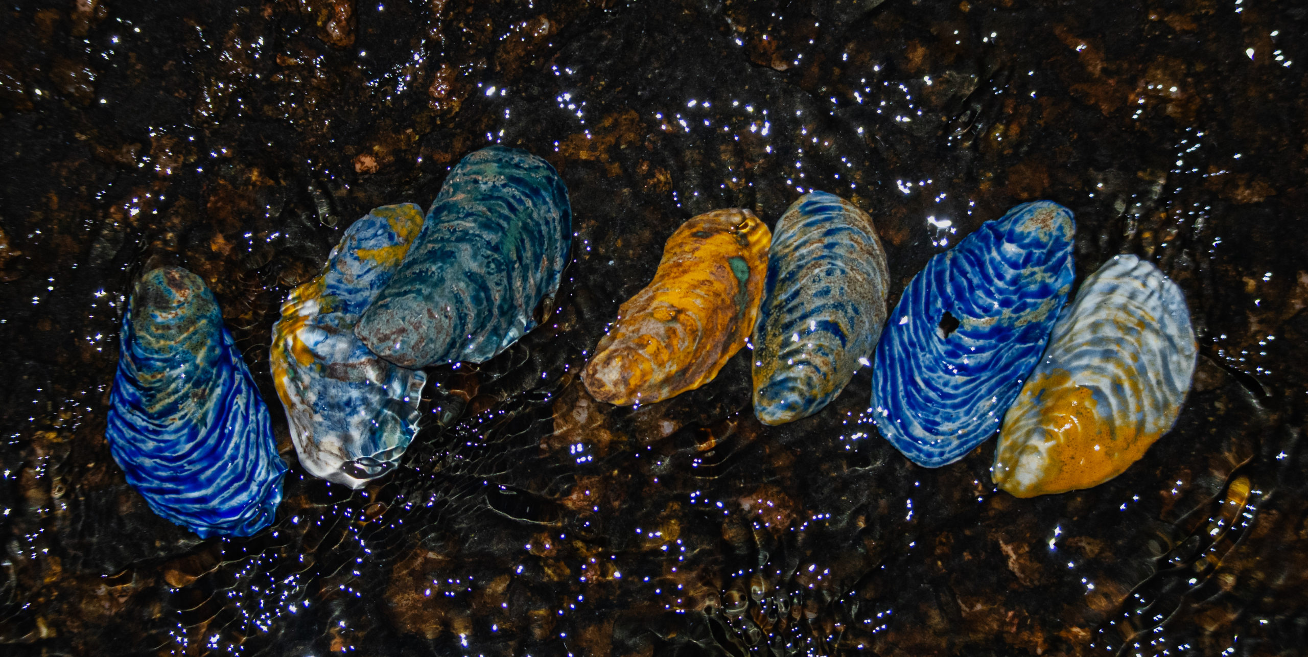 Travail d’émaux sur production en céramique moulée. Ces coquilles re questionnent les couleurs et motifs de ces crustacés, par un protocole réintégrant des coquilles concassées en poudre à la terre et aux émaux. Les émaux sont ensuite appliqués en superposition afin de reproduire les effets de la construction d’une coque.