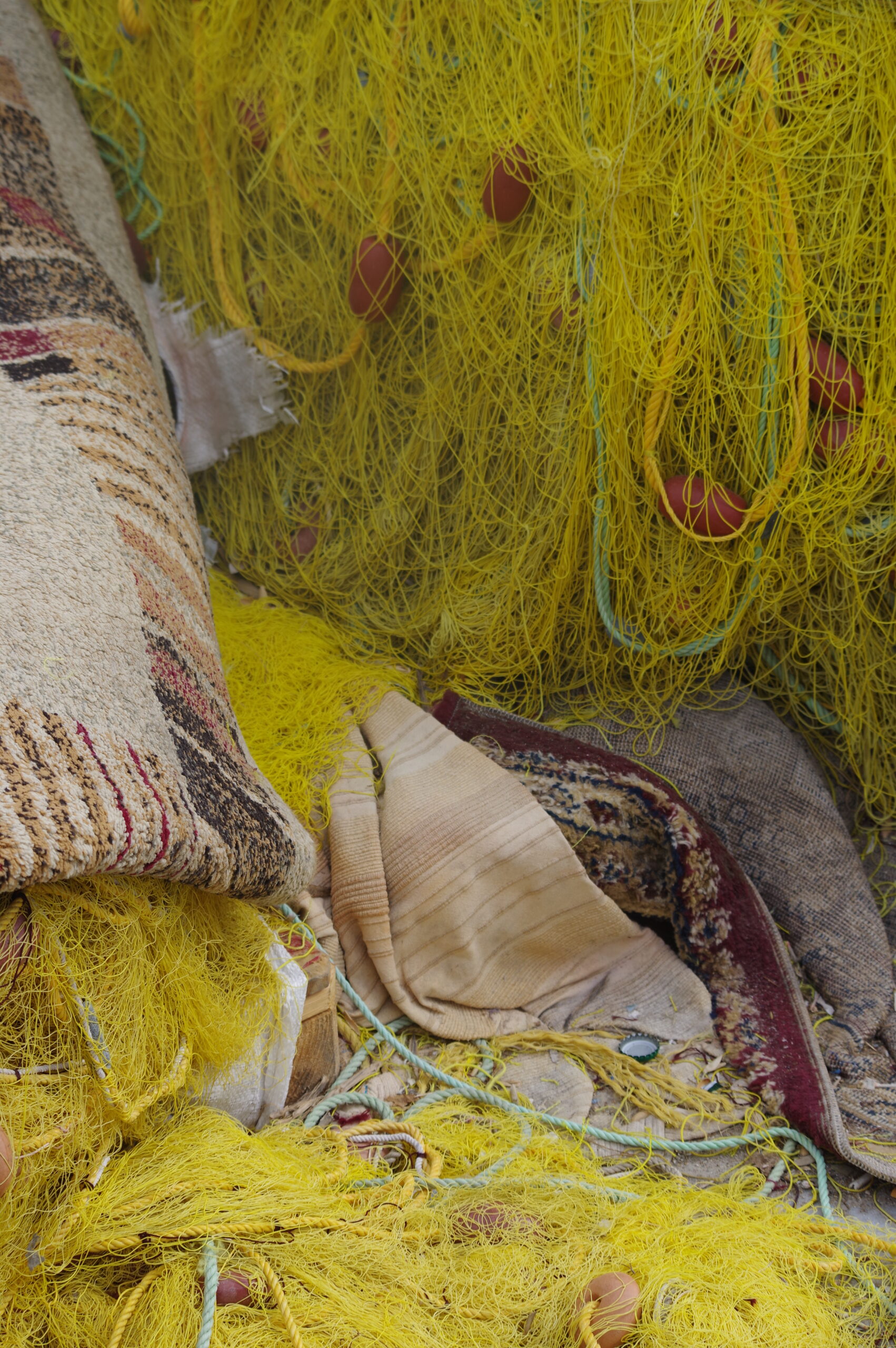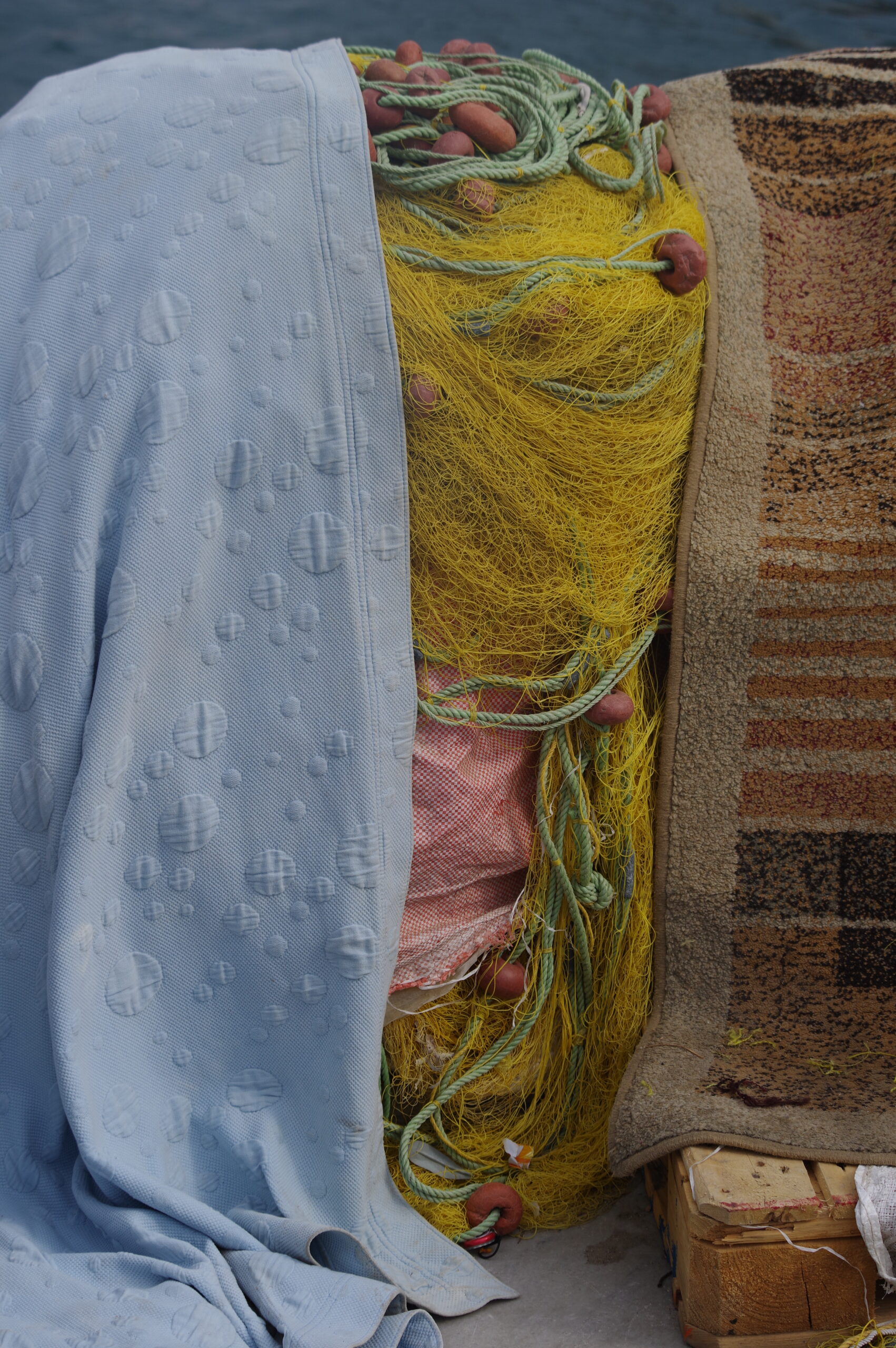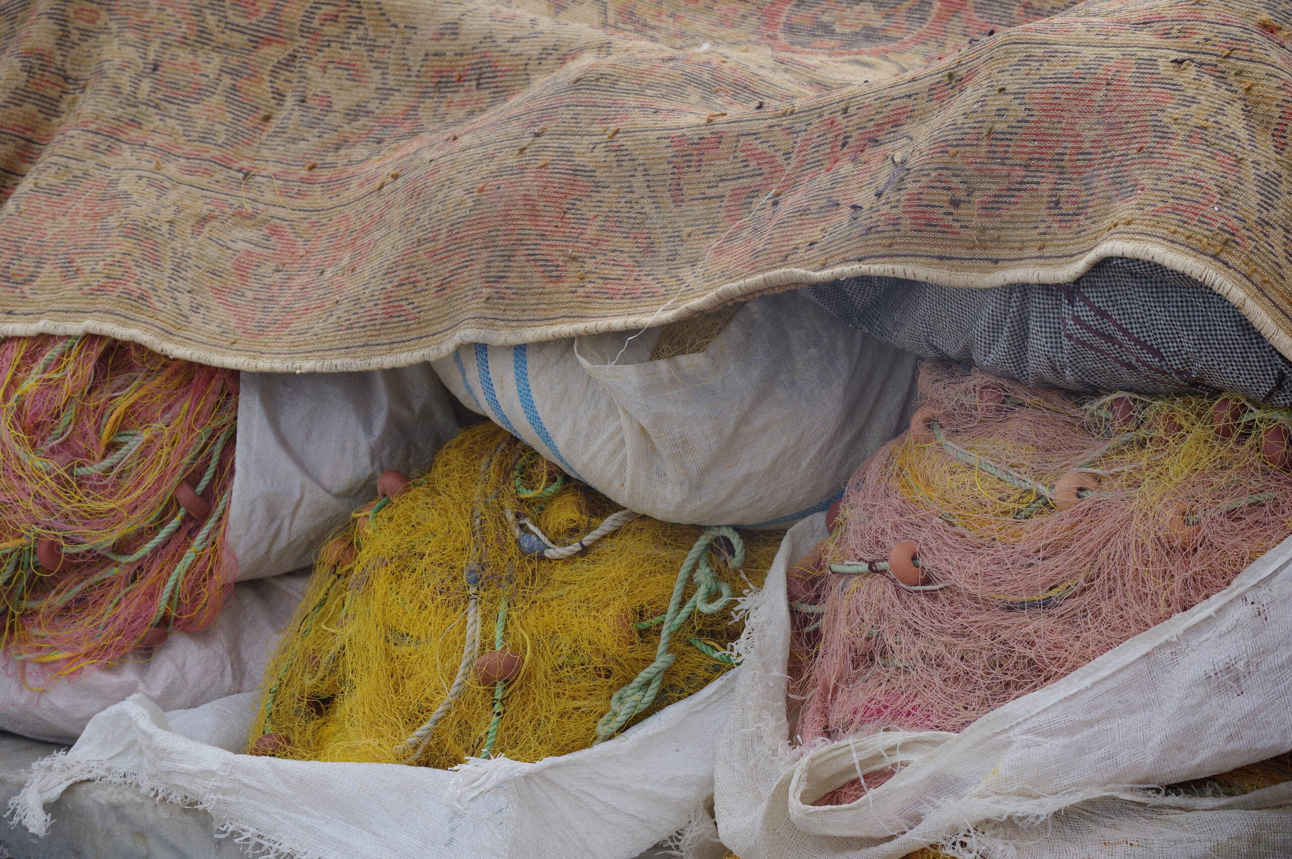 pêche Printemps 2024 Tinos, Grèce Prise de vue de matériels de pêcheurs échoué dans un port sur l’île de Tinos.